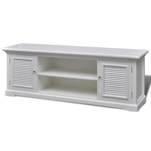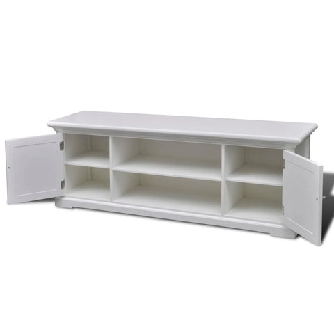 This elegant wooden TV stand in antique look with clean lines is a perfect addition to nearly any interior style, from ultra-modern lofts to casual family rooms. It will add a touch of style to your home theater set-up. The TV console has four shelves with two doors, which provide out-of-sight storage for games, movies, music and other entertainment essentials. A further two shelves can accommodate different home entertainment systems, such as CD players, DVD players and DVR systems. The wide top surface of this TV cabinet makes it ideally suitable for showcasing a freestanding wide screen plasma or LCD television. Made from sturdy MDF and pine wood, the TV stand holds up well to everyday wear and tear. The white paint finish makes it easy to clean with a damp cloth.