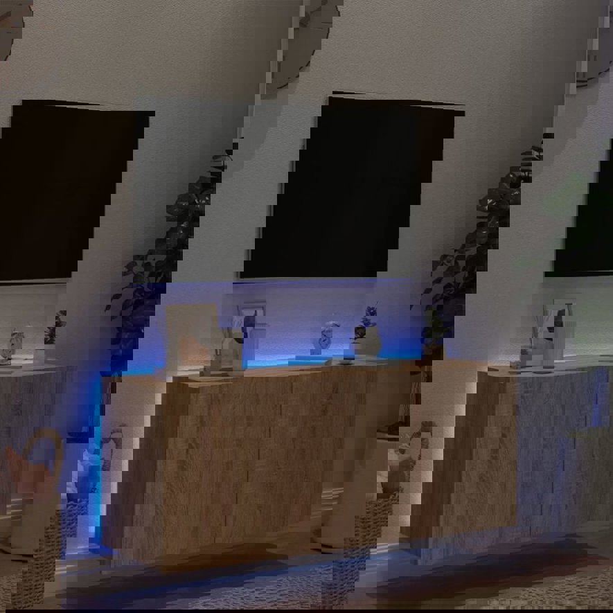 This TV wall cabinet is the perfect solution for your living space to maximise space and keep the floor areas uncluttered. Durable material: The engineered wood is of exceptional quality with a smooth surface and also features strength, stability and resistance to moisture.RGB LED lights: The wall media cabinet is equipped with vibrant RGB LED lights. With various customisable menus, you can effortlessly change the colour of the lights and even set them to adjust automatically. These LED lights not only enhance the contemporary look of the floating TV unit but also add to its trendy appeal.Ample storage space: The TV wall unit has 2 compartments behind the doors that offer ample space to keep your small items like books, DVDs, and magazines neatly organized and within reach.Wall-mounted design: This LED cabinet can be wall-mounted to add extra storage space. That way, you can maximise your floor space and keep the area clean. Good to know:Screws and plugs for inside the wall are not included. We advise to find and use screws and plugs suitable specifically for your walls. If you're not sure, you can consult with a professional. Please read and follow each step of the instructions.The product has a USB connector that requires a certified 5V USB power source (not included).