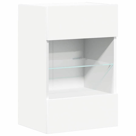 These wall cabinets are the perfect solution for your living space to maximise space and keep the floor areas uncluttered. Durable material: The engineered wood is of exceptional quality with a smooth surface and also features strength, stability and resistance to moisture.RGB LED lights: The wall media cabinet is equipped with vibrant RGB LED lights. With various customisable menus, you can effortlessly change the colour of the lights and even set them to adjust automatically. These LED lights not only enhance the contemporary look of the floating TV unit but also add to its trendy appeal.Ample storage space: The TV wall unit has a glass shelf and 2 compartments behind the doors that offer ample space to keep your small items like books, DVDs, and magazines neatly organized and within reach.Versatile: The cabinet is multifunctional and can be used as a TV wall cabinet or a wall-mounted bedside cabinet. You can also combine it with other cabinets to create a stunning living wall.Wall-mounted design: This LED cabinet can be wall-mounted to add extra storage space. That way, you can maximise your floor space and keep the area clean. Good to know:Screws and plugs for inside the wall are not included. We advise to find and use screws and plugs suitable specifically for your walls. If you're not sure, you can consult with a professional. Please read and follow each step of the instructions.The product has a USB connector that requires a certified 5V USB power source (not included).