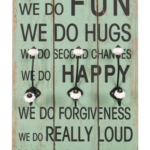 With its vintage-style print reading "In this house…we do real we do mistakes we do fun we do hugs we do second chances we do happy we do forgiveness we do really loud we do family we do love", this wall-mounted coat rack with 6 hooks will become a real eye-catcher that your guests will immediately notice. The coat rack is made of MDF board, which is very sturdy. Designed with two rows of three exquisite metal hooks, the coat rack has ample space for your coats, bags, scarves, hats or other small items. With two attachment points on the back, the coat rack can be easily mounted onto the wall. The assembly is easy. Delivery also includes the required mounting materials.