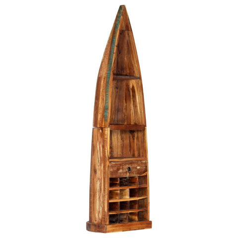 Bring the luxury of whimsical and vintage design to your interior with our boat-inspired wooden wine rack! This vintage-style wine rack will become the central of attention of your interior decor with its avantgarde design. This wine cabinet is made of solid reclaimed wood that has been sourced from joists, floors and support beams from old demolished buildings, and it can consist of different types of wood like pinewood, teak, beech, oak, cedar, mango wood, acacia, etc. This means the reclaimed wood retains the characteristics of these different types of wood. Reclaimed wood is already aged, weathered and dried, so it doesn't shrink or bend. The exquisite craftsmanship and the aesthetically-appealing wood grains make every piece of bar furniture unique and slightly different from the next. The wine cabinet is fully handmade and each step of the process is carried out with the greatest care, be it polishing, painting or lacquering. Featuring 16 bottle compartments, 1 drawer and 3 shelves, the wine rack provide ample space for storing your wine bottles and some accessories. Important note: Colours and wood grain vary from piece to piece, making each of our wine racks unique. The delivery is random, ensuring the exclusivity and individuality of your product. Warning: To prevent it from tipping over, this product must be used with the provided wall attachment device.