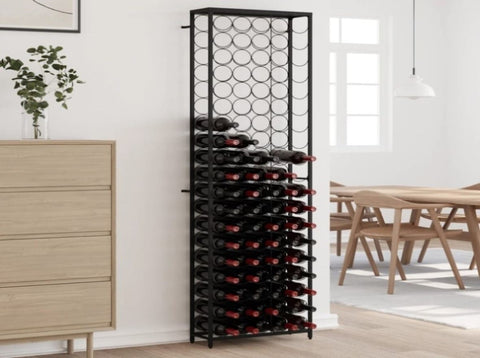 Store, age and display your wine in style with this wine rack! Large capacity: This wine holder can hold up to 95 bottles, effectively maximising storage space and keeping the area tidy. Stable construction: This wine bottle holder is made of sturdy wrought iron with a black powder-coated finish to resist oxidation and rust. The included wall fixings prevent the wine stand from swaying or tilting, making it suitable for years of use. Suitable for many places: Featuring a simple and elegant design, this wine storage rack is perfect for use in bars, wine cellars, kitchens, restaurants, and more. Warning:To prevent it being overturned, this product must be used with the provided wall attachment device.