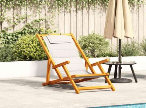 This folding beach chair is perfect for the beach, campsite, or garden. With a sturdy frame and comfortable textilene padded seat, it’s durable and weather-resistant. Padded textilene seating: The padded seating is upholstered in textilene fabric, a durable blend of PVC and polyester. This weather-resistant material offers a soft, breathable surface for enhanced comfort and long-lasting use.Multi-position reclining: Designed to recline in three positions, the outdoor chair accommodates various lounging preferences, making it ideal for reading, napping, or simply enjoying leisure time.Sturdy and durable frame: Solid acacia wood is known for its strength and lasting durability. Its exceptional stability and weather resistance provide a secure seating experience, making it ideal for outdoor seats.Portable and space-saving: The foldable design allows for easy portability and storage, making the chair perfect for outdoor activities or compact living spaces without sacrificing comfort.Enhanced comfort: Featuring a supportive headrest pillow and armrests, this folding chair provides additional comfort and cushioning, ensuring a cosy experience for extended use. Good to know:To make sure your outdoor furniture stays beautiful, we recommend protecting it with a waterproof cover.