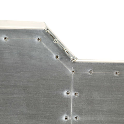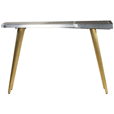 This vintage-style Aviator writing desk has a timeless design and will bring a touch of industrial style into your study room or office. The aircraft-style desk is made of solid mango wood, and its surface is clad with the patchwork of polished aluminium panels, accented with the exposed steel screws, which makes it extremely durable. The steel legs in brass colour and patterned rivets give the airman table an industrial look. It has a large table top which provides ample space for placing your files, papers, books or other belongings. The writing desk is easy to assemble. Please note: The pattern of the rivets may vary from piece to piece, making each of our tables unique. The delivery is random, ensuring the exclusivity and individuality of your product.