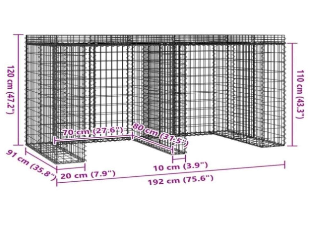 This gabion wall for garbage bin is a great choice to contain your garbage bin in your garden or patio. Durable material: It is made of corrosion-resistant galvanised iron for stability and durability, and with a sturdy gabion wire diameter of 3,5 mm, the gabion wall will surely adorn your garden in every season. Stable construction: The gabion basket is designed to be filled with rocks or gravel for stable construction. Multifunctional design: This gabion can not only accommodate 2 bins, but its top is also suitable for growing flowers and plants, adding a bright decoration to your garden. Strengthened gabion hooks: Included strengthened gabion hooks connect the opposing wire panels tightly together so that the stone cage retaining wall can keep its shape even when filled with rock or other materials. Convenient use: After the assembly is complete, all you need to do is fill the gabion wall basket with stones for immediate use. It can be filled with natural materials such as concrete, sandstone and coloured stone. Good to know:To make assembly as easy as possible, each product is delivered with a manual. The stones are not included in the delivery.