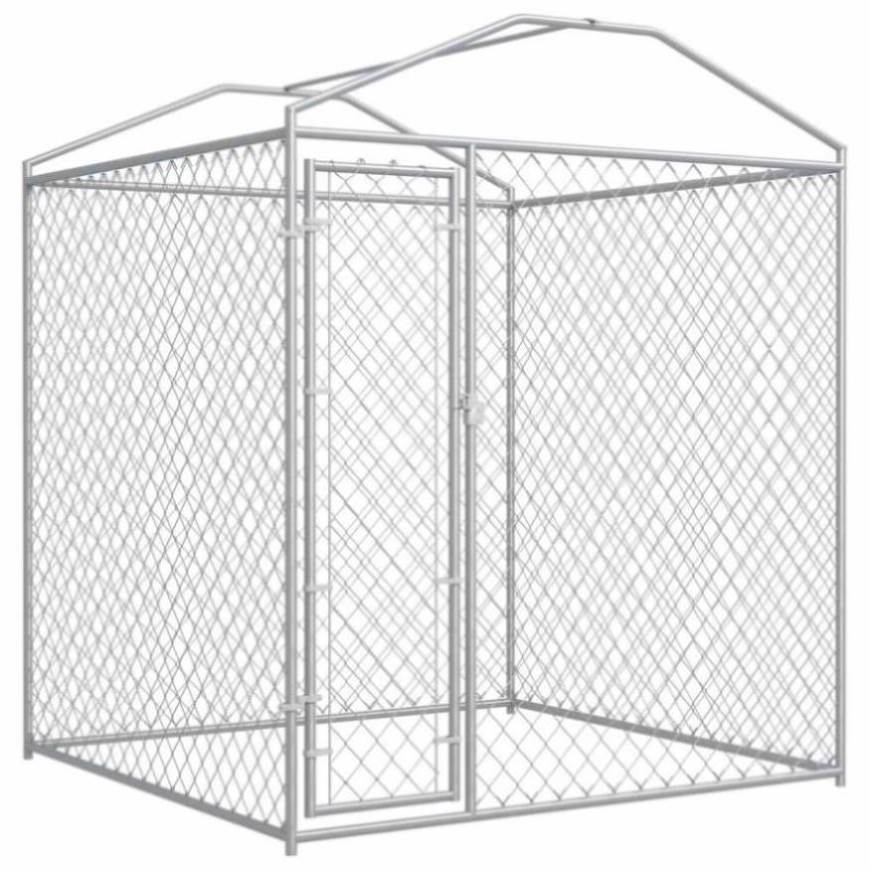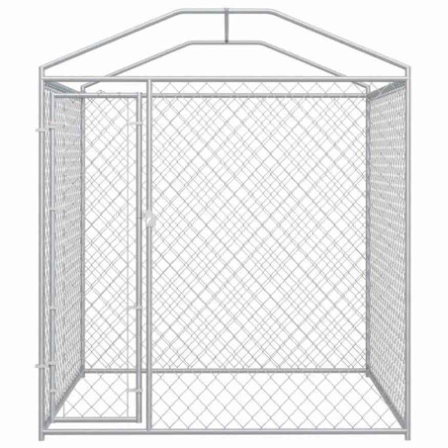 This versatile dog kennel has multiple uses: playing, exercising, training, or simply keeping your dogs safe. It will be the perfect play paradise for your furry friends! This large dog kennel provides ample exercise space while the chain link mesh all around helps prevent mischief and unexpected accidents, while enabling ventilation. The dog kennel is made of galvanised steel. The included top canopy, made of 100% polyethylene, is fire-resistant and UV protected. The hinged door swings outwards and ensures extra security and safety for your dogs thanks to the lockable latch system. Assembly is really easy. Delivery also includes one canopy top. Good to know:To prevent damage from heavy snow buildup, we recommend clearing the roof regularly during winter.